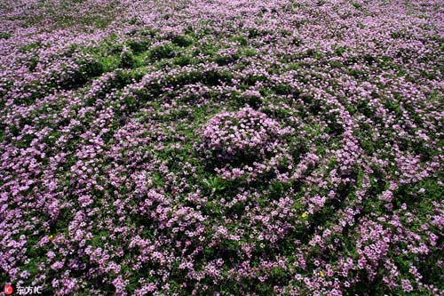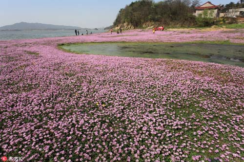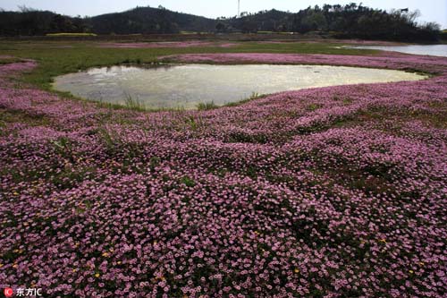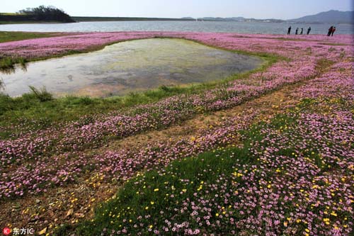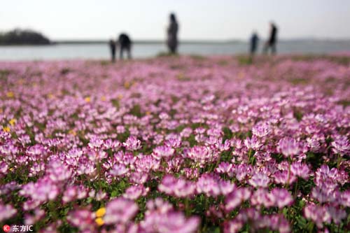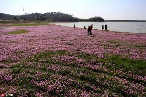 2017年3月26日,在我國最大淡水湖鄱陽湖畔,紫云英等盡情綻放。藍天白云,青山碧水,紅花綠草構成的醉美春色,吸引不少游客觀賞拍攝。