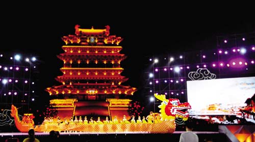 競(jìng)演最后,一條巨龍騰空而起,象征著我市文化旅游產(chǎn)業(yè)像一條騰飛的巨龍,抬龍頭、挺龍胸、舞龍身、活龍水。