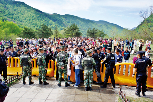 5月18日深夜,隨著三個(gè)入山口人流的驟增,原定22時(shí)30分上崗的民警提前到20時(shí)全部到位。23時(shí)40分,記者來到南線游客中心,只見潮水般的人群涌向售票大廳,不少公安民警在安監(jiān)門口嚴(yán)密把守,有序放行,站在臺階上的民警手舉超大口徑的大喇叭向嘈雜擁擠的人海不斷地呼喊:“不要擁擠,有序排隊(duì)!”在游客中心東邊的交通要道上,全副武裝的交通民警正在緊張地疏導(dǎo)川流不息的車輛。19日1時(shí)燈光下,記者看到擔(dān)任此次安保總指揮的市公安局局長楊梅喜在寒風(fēng)中與民警一道指揮交通。