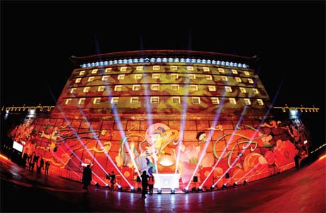 西安城墻新春燈會上被裝飾一新的箭樓(2月8日攝)。2月8日晚,2018年西安城墻新春燈會在陜西西安明城墻開幕。“魚化龍”“鳥語花香”“夢與飛翔”等萬盞彩燈把古都裝點得金碧輝煌。
