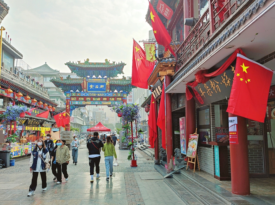 10月7日,省城食品街,在查驗(yàn)雙碼、測量體溫后,游客愉快購物、體驗(yàn)美食,享受假期的輕松和歡樂。