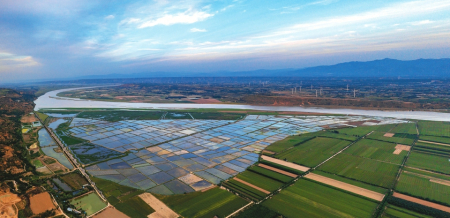 芮城縣境內(nèi)蜿蜒前行的黃河與岸邊碧綠的田野相映成趣。