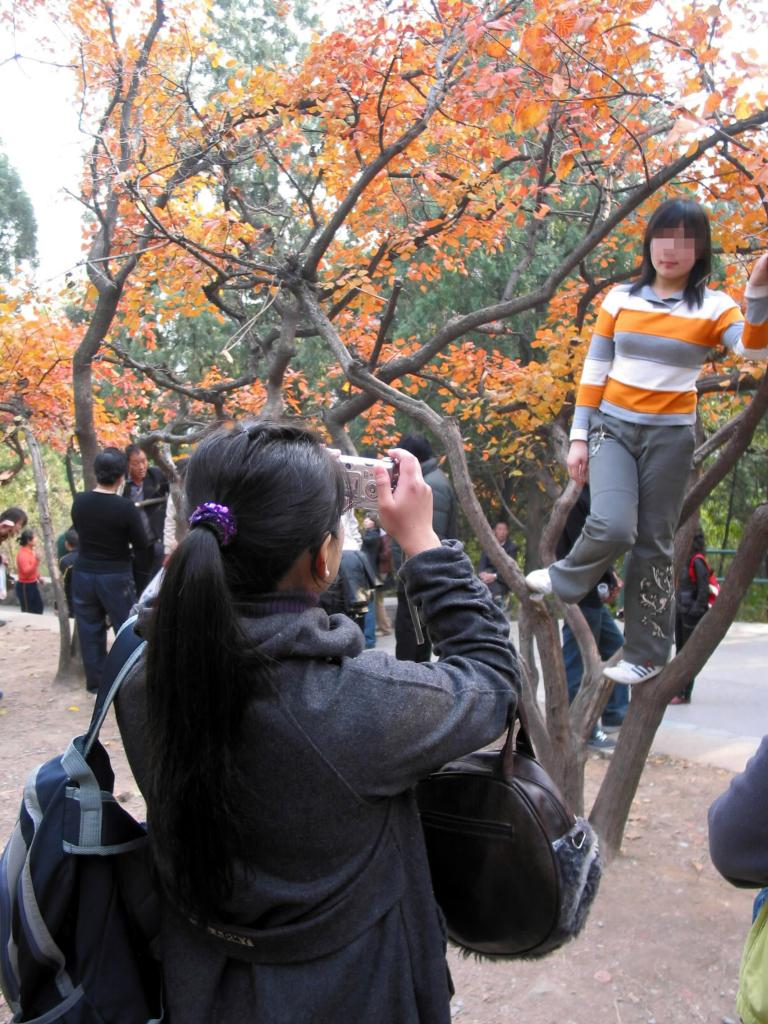 2007年11月4日,不少游客來(lái)到北京香山觀賞紅葉,一名游客爬上樹與紅葉合影。新華社記者孫洪磊攝
