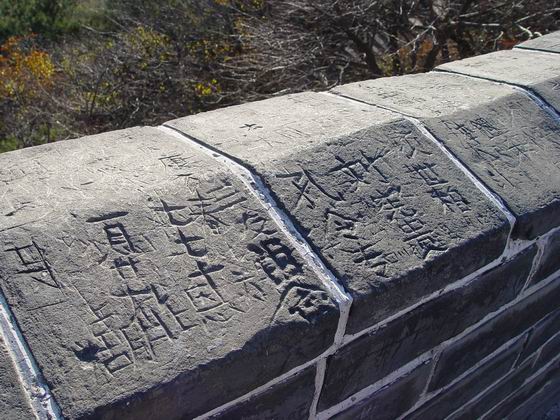 游客在北京八達(dá)嶺長(zhǎng)城城墻頂部刻的字(2005年11月攝)。新華社發(fā)(鄭嚴(yán)攝)