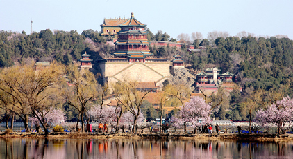 2024年3月19日,北京頤和園西堤,山桃花爭相盛開,與古建亭橋相映成景。丁幫學攝(人民圖片網)