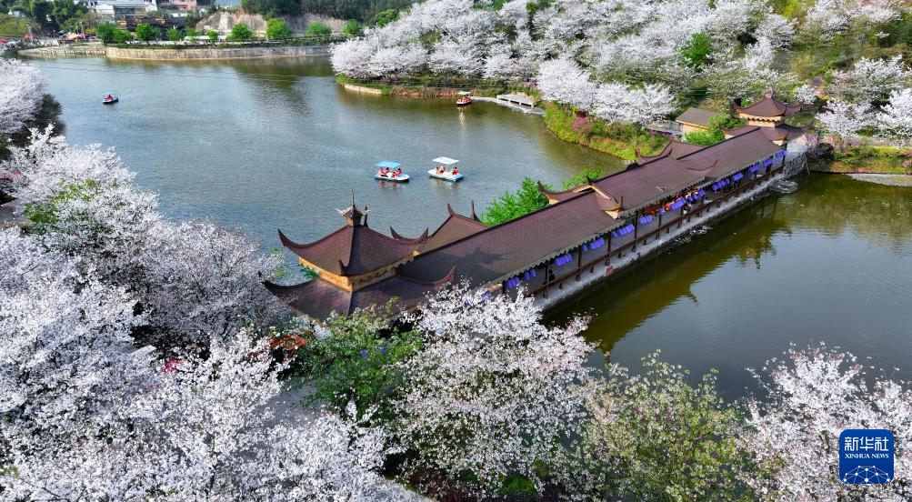 3月24日,游人在瀘州市江陽區(qū)丹林鎮(zhèn)建設(shè)村“櫻花谷”泛舟賞櫻(無人機(jī)照片)。
