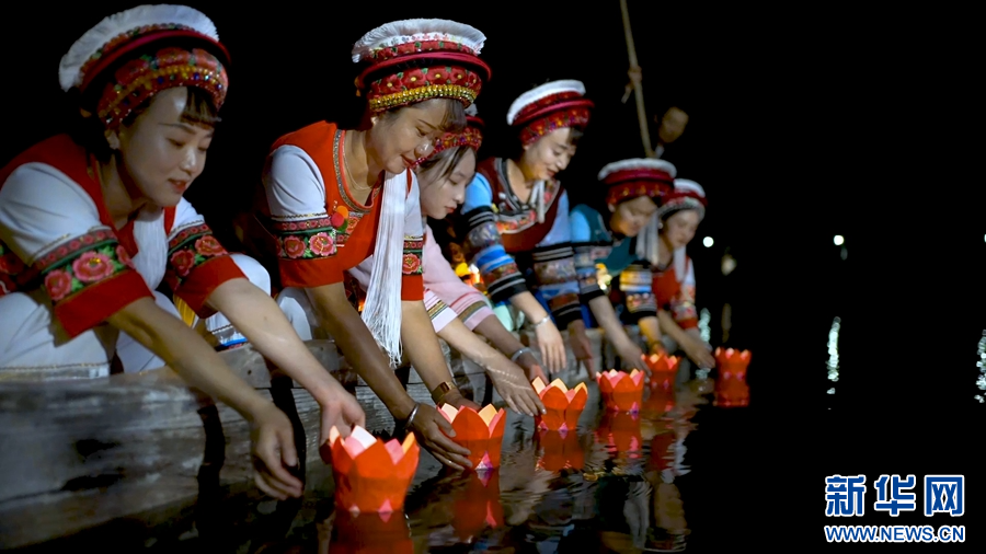 大理洱源西湖“水上火把節(jié)”,幾名白族姑娘放燈祈福(視頻截圖)。