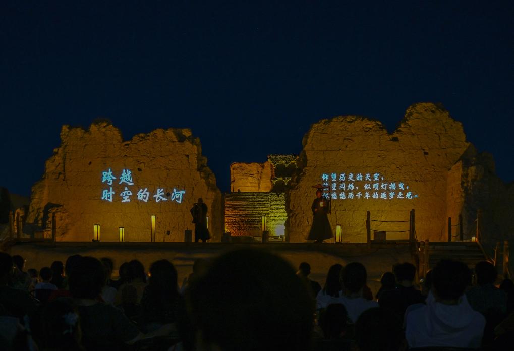 深藍(lán)色夜幕下,兩排戶外燈照亮高大殘舊的城墻。身著僧侶服飾的演員雙手合十、懷抱經(jīng)卷,從夜色中走來(lái)。時(shí)鐘隨著他的朗誦,仿佛回轉(zhuǎn)到佛教鼎盛期的唐代西域。在舞臺(tái)前方席地而坐的游客,看得如醉如癡。