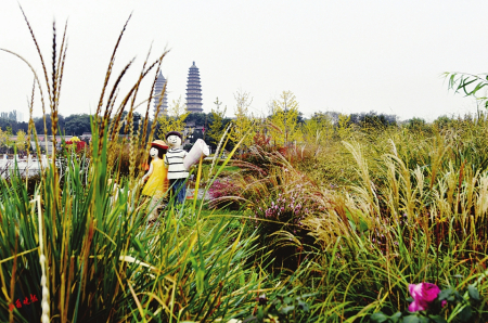 4.雙塔掩映在花境微景觀中。