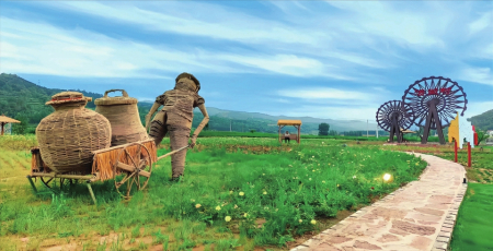 游走村內,瀟河源文化主題公園里有不少新穎物件:風動的鐵藝風車,像向日葵一般對著太陽開合;可以鍛煉用的水槍,需要用力向下壓幾下才能噴出很遠的水,用來澆灌花叢;還有會唱歌的“石頭”、用木條編制成的敲鑼大兔子……村內樹木叢生,百草豐茂,綠葉水光交織,讓人心曠神怡,流連忘返。