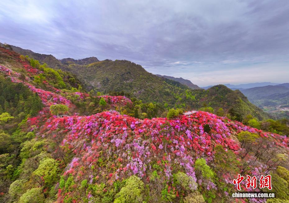 清明假期,位于大別山腹地的安徽省安慶市岳西縣河圖鎮(zhèn)天峽風(fēng)景區(qū)內(nèi),千畝野生高山杜鵑迎來(lái)最佳觀賞期。漫山遍野的杜鵑花海沿山脊鋪展,紅、粉、紫、白各色花朵競(jìng)相綻放,將大別山腹地裝點(diǎn)成一幅絢麗的春日畫(huà)卷。圖為4月5日杜鵑花盛開(kāi)景色。