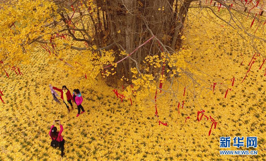 11月19日,游客在留壩縣玉皇廟鎮(zhèn)參觀千年銀杏樹(shù)。初冬時(shí)節(jié),在秦嶺深處的陜西省留壩縣玉皇廟鎮(zhèn)石窯壩村,一棵千年古銀杏樹(shù)的落葉宛如金色地毯,甚為壯觀。據(jù)當(dāng)?shù)亓謽I(yè)部門(mén)介紹,該樹(shù)胸徑為4.45米,現(xiàn)有高度29米。新華社記者 陶明 攝