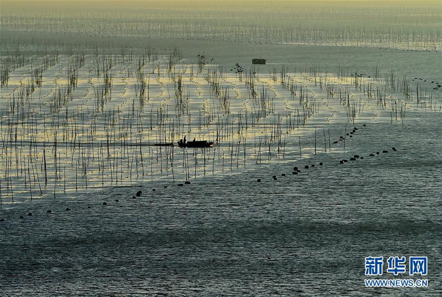 12月9日,夕陽西下,一艘漁船穿行在海上紫菜養(yǎng)殖架間。福建省寧德市的霞浦縣以美麗的淺海、灘涂聞名,豐富的旅游資源和人文資源一直是攝影師追逐的靈感所在。 新華社記者魏培全攝
