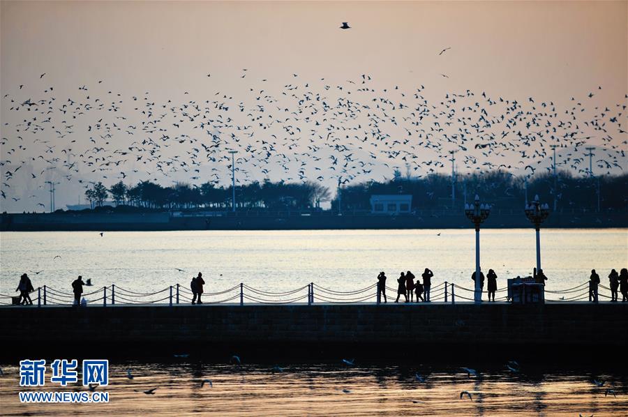 1月10日,水鳥在青島棧橋景區(qū)一帶飛翔。當(dāng)日,山東省青島市天氣晴好,黃昏時(shí)分沿海一帶景色迷人。 新華社發(fā)(王海濱 攝)