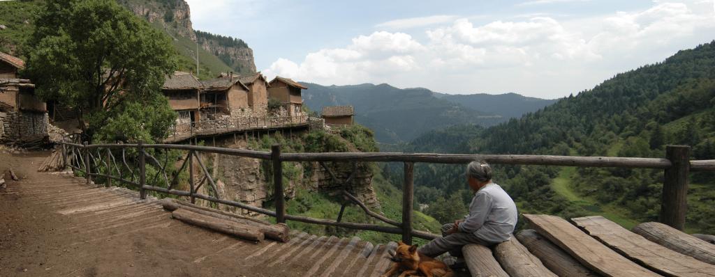隱沒(méi)在深山老林中的王化溝分布在大約一華里長(zhǎng)的絕壁上,背依懸崖,面臨百丈深淵。全村20余戶,60多口人。村西的懸崖上聳立著一塊巨石,村里人稱之為“石人”,村后的山也因此稱作“石人山”。村中的房子大都臨崖而建,以木柱支撐,高低錯(cuò)落,避風(fēng)向陽(yáng)。這些房子建在懸崖上看似危險(xiǎn),實(shí)則非常堅(jiān)固,至今還有清代的房子保存完好。由于地盤不足,所以沒(méi)了庭院,只有一條走廊。就是街道也只能用木料搭建,懸于空中。當(dāng)然作為農(nóng)家,牲畜的圈舍是免不了的,這里也需要精心擺布,精心建造,絕不至于讓牲畜落下深淵。