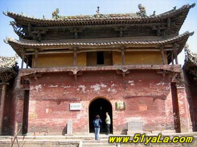 山門最古,為金時原構(gòu),五開間,兩層,下層磚砌高臺,中柱上裝青石門框及板門,門框上線刻花紋,圖案秀美。上層施平座及勾欄,粱架現(xiàn)整簡潔,結(jié)構(gòu)已具元代爬梁的雛形。屋頂琉璃為明代補制,鮮麗勁秀。這種高臺以上的門廡或殿宇,見宇敦煌壁畫,實物中少有。