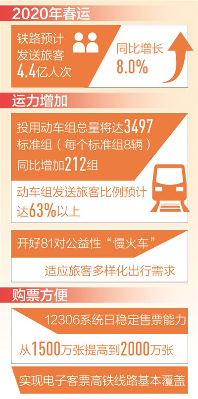 國鐵集團(tuán)相關(guān)負(fù)責(zé)人介紹,2020年鐵路春運(yùn)自1月10日開始,2月18日結(jié)束,共40天,節(jié)前15天,節(jié)后25天。鐵路部門安排節(jié)前每日開行旅客列車5275對,運(yùn)輸能力達(dá)到1010萬人;節(jié)后每日開行旅客列車5410對,運(yùn)輸能力達(dá)到1043萬人。