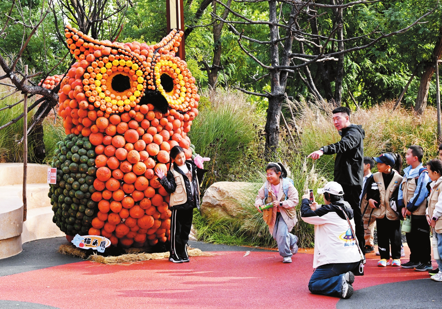 近日,青島東方伊甸園舉行“南瓜藝術(shù)王國”主題展。圖為小朋友在排隊(duì)與“南瓜貓頭鷹”合影。 新華社記者 李紫恒 攝