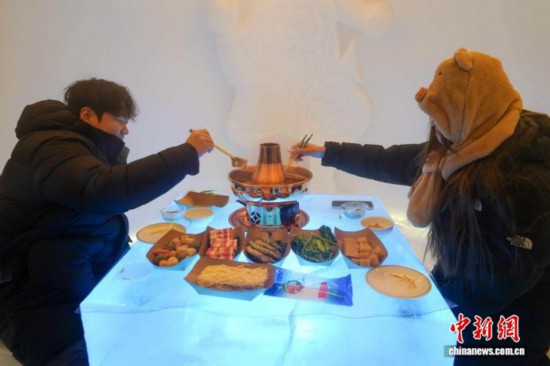 在-22℃的冰天雪地,游客體驗(yàn)雪屋火鍋,感受“冰火兩重天”的極致溫差。趙宇航 攝