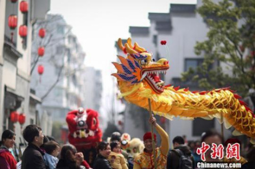 2015年農(nóng)歷二月初二,民間舞龍隊(duì)在南京城南老街舞龍。泱波 攝