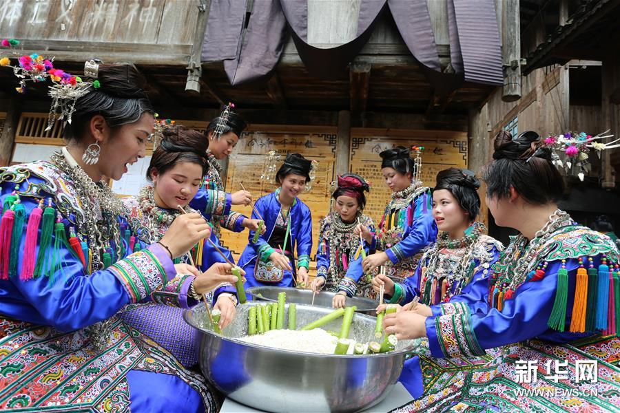 5月3日,貴州省首批魅力侗寨——榕江縣烏公侗寨歡度傳統(tǒng)的竹米節(jié),重溫侗民遠(yuǎn)古農(nóng)耕風(fēng)情。竹米節(jié)也叫吃竹筍飯,在每年谷雨至立夏期間竹筍生長的時(shí)候,侗族群眾采摘斑竹筍,把糯米灌進(jìn)筍筒煮熟食用。這樣既能保持米飯的原味,又有竹筍的清香,并且還方便攜帶至坡上田間地頭食用。久而久之,侗族人每到春夏之交的農(nóng)耕時(shí)節(jié)都會(huì)過竹米節(jié),殺豬宰羊祭祀侗族祖先,唱歌跳舞祈求五谷豐登。新華社發(fā)(楊成利 攝)