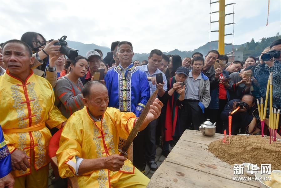 農(nóng)歷十月十五前后,福建西部武平縣各山村陸續(xù)進入農(nóng)閑時節(jié)。按照當(dāng)?shù)仫L(fēng)俗,不同村子各自擇日舉辦民間活動,其中較有代表性的就是“上刀山”絕技?!吧系渡健苯^技在閩西山村流傳已有數(shù)百年歷史,表演者需光腳順著磨得鋒利閃亮的36把鋼刀,攀登至8米高的杉木柱子頂部,接受長者祝福,祈求風(fēng)調(diào)雨順、五谷豐登。新華社記者 宋為偉 攝