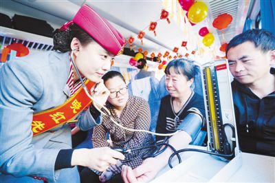 列車工作人員為旅客量血壓/人民日?qǐng)?bào)記者賀勇攝