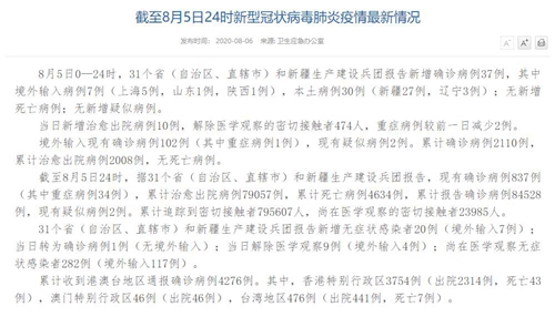 人民網(wǎng)北京8月6日電(董童)國(guó)家衛(wèi)生健康委于今日在官網(wǎng)發(fā)布的《截至8月5日24時(shí)新型冠狀病毒肺炎疫情最新情況》(以下簡(jiǎn)稱“情況”)提出,8月5日0—24時(shí),31個(gè)?。ㄗ灾螀^(qū)、直轄市)和新疆生產(chǎn)建設(shè)兵團(tuán)報(bào)告新增確診病例37例,其中境外輸入病例7例(上海5例,山東1例,陜西1例),本土病例30例(新疆27例,遼寧3例);無(wú)新增死亡病例;無(wú)新增疑似病例。當(dāng)日新增治愈出院病例10例,解除醫(yī)學(xué)觀察的密切接觸者474人,重癥病例較前一日減少2例。