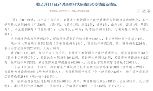 情況顯示,截至8月11日24時,據(jù)31個?。ㄗ灾螀^(qū)、直轄市)和新疆生產(chǎn)建設兵團報告,現(xiàn)有確診病例761例(其中重癥病例40例),累計治愈出院病例79342例,累計死亡病例4634例,累計報告確診病例84737例,現(xiàn)有疑似病例3例。累計追蹤到密切接觸者802908人,尚在醫(yī)學觀察的密切接觸者23039人。