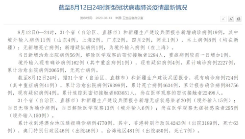 人民網(wǎng)北京8月13日電(董童)國家衛(wèi)生健康委于今日在官網(wǎng)發(fā)布的《截至8月12日24時(shí)新型冠狀病毒肺炎疫情最新情況》(以下簡稱“情況”)提出,8月12日0—24時(shí),31個(gè)?。ㄗ灾螀^(qū)、直轄市)和新疆生產(chǎn)建設(shè)兵團(tuán)報(bào)告新增確診病例19例,其中境外輸入病例11例(山東4例,上海2例,廣東2例,四川2例,河北1例),本土病例8例(均在新疆);無新增死亡病例;新增疑似病例1例,為境外輸入病例(在上海)。當(dāng)日新增治愈出院病例56例,解除醫(yī)學(xué)觀察的密切接觸者1284人,重癥病例較前一日增加1例。