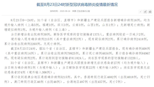 人民網(wǎng)北京8月24日電(董童)國(guó)家衛(wèi)生健康委于今日在官網(wǎng)發(fā)布的《截至8月23日24時(shí)新型冠狀病毒肺炎疫情最新情況》(以下簡(jiǎn)稱“情況”)提出,8月23日0—24時(shí),31個(gè)?。ㄗ灾螀^(qū)、直轄市)和新疆生產(chǎn)建設(shè)兵團(tuán)報(bào)告新增確診病例16例,均為境外輸入病例(上海5例,福建3例,四川3例,云南3例,山西1例,山東1例);無新增死亡病例;新增疑似病例1例,為境外輸入病例(在上海)。當(dāng)日新增治愈出院病例30例,解除醫(yī)學(xué)觀察的密切接觸者1375人,重癥病例較前一日減少2例。