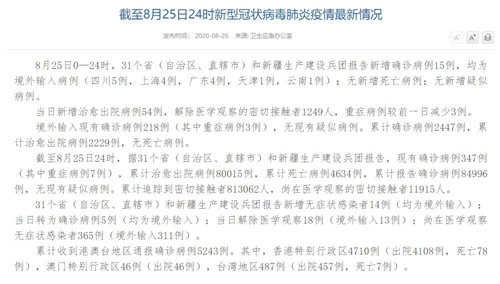 情況顯示,截至8月25日24時,據31個?。ㄗ灾螀^(qū)、直轄市)和新疆生產建設兵團報告,現有確診病例347例(其中重癥病例7例),累計治愈出院病例80015例,累計死亡病例4634例,累計報告確診病例84996例,無現有疑似病例。累計追蹤到密切接觸者813062人,尚在醫(yī)學觀察的密切接觸者11915人。