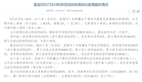 人民網(wǎng)北京8月28日電(董童)國(guó)家衛(wèi)生健康委于今日在官網(wǎng)發(fā)布的《截至8月27日24時(shí)新型冠狀病毒肺炎疫情最新情況》(以下簡(jiǎn)稱“情況”)提出,8月27日0—24時(shí),31個(gè)?。ㄗ灾螀^(qū)、直轄市)和新疆生產(chǎn)建設(shè)兵團(tuán)報(bào)告新增確診病例9例,均為境外輸入病例(四川4例,上海3例,福建1例,廣東1例);無(wú)新增死亡病例;新增疑似病例2例,均為境外輸入病例(均在上海)。當(dāng)日新增治愈出院病例45例,解除醫(yī)學(xué)觀察的密切接觸者1654人,重癥病例與前一日持平。