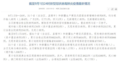 截至9月1日24時,據(jù)31個省(自治區(qū)、直轄市)和新疆生產(chǎn)建設(shè)兵團報告,現(xiàn)有確診病例198例(其中重癥病例3例),累計治愈出院病例80234例,累計死亡病例4634例,累計報告確診病例85066例,無現(xiàn)有疑似病例。累計追蹤到密切接觸者816307人,尚在醫(yī)學(xué)觀察的密切接觸者7587人。