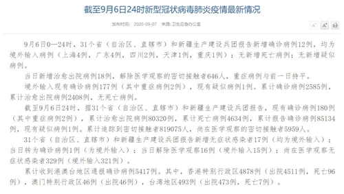 人民網(wǎng)北京9月7日電(董童)國(guó)家衛(wèi)生健康委于今日在官網(wǎng)發(fā)布的《截至9月6日24時(shí)新型冠狀病毒肺炎疫情最新情況》(以下簡(jiǎn)稱(chēng)“情況”)提出,9月6日0—24時(shí),31個(gè)省(自治區(qū)、直轄市)和新疆生產(chǎn)建設(shè)兵團(tuán)報(bào)告新增確診病例12例,均為境外輸入病例(上海4例,廣東4例,四川2例,天津1例,重慶1例);無(wú)新增死亡病例;無(wú)新增疑似病例。當(dāng)日新增治愈出院病例18例,解除醫(yī)學(xué)觀察的密切接觸者646人,重癥病例與前一日持平。