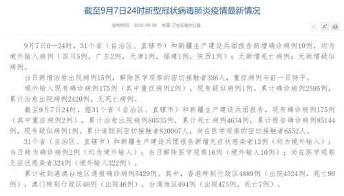 | 國(guó)家衛(wèi)健委:9月7日新增確診病例10例 均為境外輸入病例 |