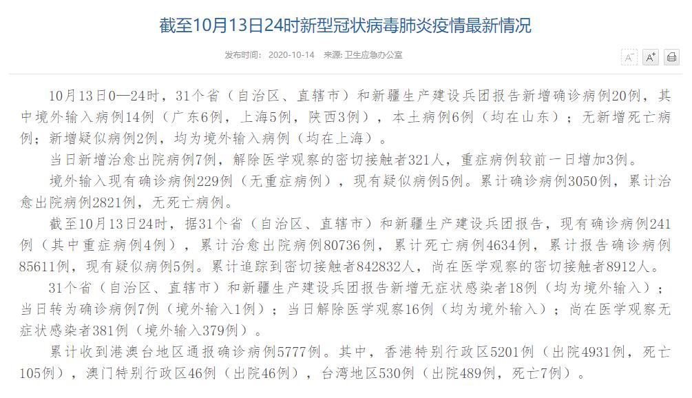 人民網(wǎng)北京10月14日電(董童)國家衛(wèi)生健康委于今日在官網(wǎng)發(fā)布的《截至10月13日24時新型冠狀病毒肺炎疫情最新情況》(以下簡稱“情況”)稱,10月13日0—24時,31個?。ㄗ灾螀^(qū)、直轄市)和新疆生產(chǎn)建設(shè)兵團報告新增確診病例20例,其中境外輸入病例14例(廣東6例,上海5例,陜西3例),本土病例6例(均在山東);無新增死亡病例;新增疑似病例2例,均為境外輸入病例(均在上海)。當日新增治愈出院病例7例,解除醫(yī)學觀察的密切接觸者321人,重癥病例較前一日增加3例。