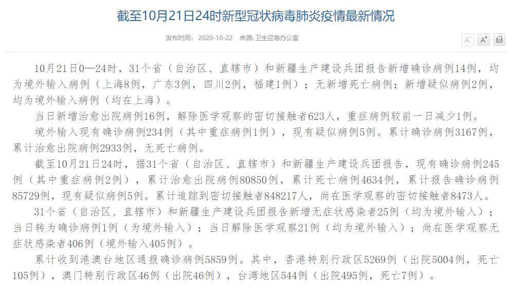 人民網(wǎng)北京10月22日電(董童)國家衛(wèi)生健康委于今日在官網(wǎng)發(fā)布的《截至10月21日24時新型冠狀病毒肺炎疫情最新情況》(以下簡稱“情況”)提出,10月21日0—24時,31個?。ㄗ灾螀^(qū)、直轄市)和新疆生產(chǎn)建設(shè)兵團(tuán)報告新增確診病例14例,均為境外輸入病例(上海8例,廣東3例,四川2例,福建1例);無新增死亡病例;新增疑似病例2例,均為境外輸入病例(均在上海)。當(dāng)日新增治愈出院病例16例,解除醫(yī)學(xué)觀察的密切接觸者623人,重癥病例較前一日減少1例。