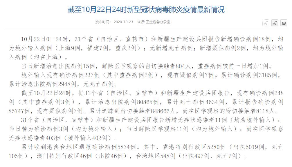 人民網(wǎng)北京10月23日電(董童)國家衛(wèi)生健康委于今日在官網(wǎng)發(fā)布的《截至10月22日24時新型冠狀病毒肺炎疫情最新情況》(以下簡稱“情況”)提出,10月22日0—24時,31個?。ㄗ灾螀^(qū)、直轄市)和新疆生產(chǎn)建設(shè)兵團(tuán)報告新增確診病例18例,均為境外輸入病例(上海9例,福建7例,重慶2例);無新增死亡病例;新增疑似病例2例,均為境外輸入病例(均在上海)。當(dāng)日新增治愈出院病例15例,解除醫(yī)學(xué)觀察的密切接觸者804人,重癥病例較前一日增加1例。