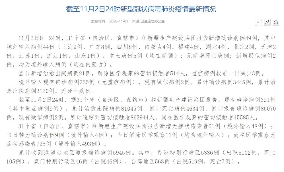 人民網(wǎng)北京11月3日電(董童)國家衛(wèi)生健康委于今日在官網(wǎng)發(fā)布的《截至11月2日24時新型冠狀病毒肺炎疫情最新情況》(以下簡稱“情況”)指出,11月2日0—24時,31個?。ㄗ灾螀^(qū)、直轄市)和新疆生產(chǎn)建設(shè)兵團(tuán)報告新增確診病例49例,其中境外輸入病例44例(上海9例,廣東8例,四川8例,內(nèi)蒙古4例,福建4例,湖北4例,北京2例,天津2例,江蘇1例,浙江1例,山東1例),本土病例5例(均在新疆);無新增死亡病例;新增疑似病例2例,均為境外輸入病例(均在內(nèi)蒙古)。當(dāng)日新增治愈出院病例21例,解除醫(yī)學(xué)觀察的密切接觸者514人,重癥病例較前一日減少3例。