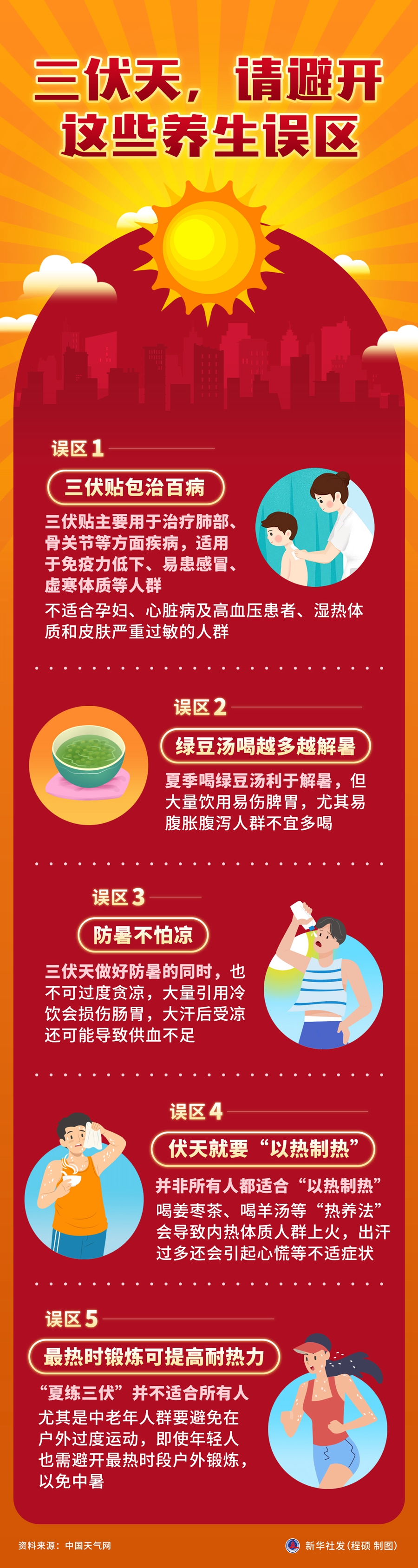 今年7月15日入伏。三伏天防暑降溫是重中之重,各種養(yǎng)生方法層出不窮,但并非適合所有人,避開以下五大誤區(qū),助您科學養(yǎng)生。 新華社發(fā) 程碩 制圖