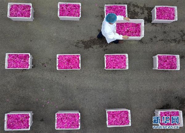 2018年4月21日,在貴州省鎮(zhèn)遠縣青溪鎮(zhèn)一家以鮮花為原料釀酒的企業(yè),工人在搬運玫瑰花(無人機拍攝)。新華社發(fā)(蔡興文 攝)