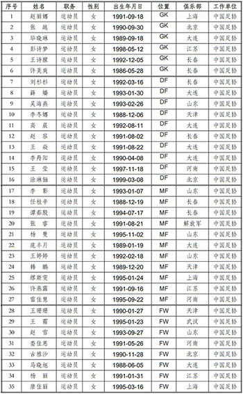 人民網(wǎng)北京5月18日電(楊磊)5月18日,中國足協(xié)在其官網(wǎng)公布了女足國家隊(duì)里約奧運(yùn)會參賽運(yùn)動員35人大名單。馬曉旭、王霜等人在列,門將王飛沒有進(jìn)入此次大名單。