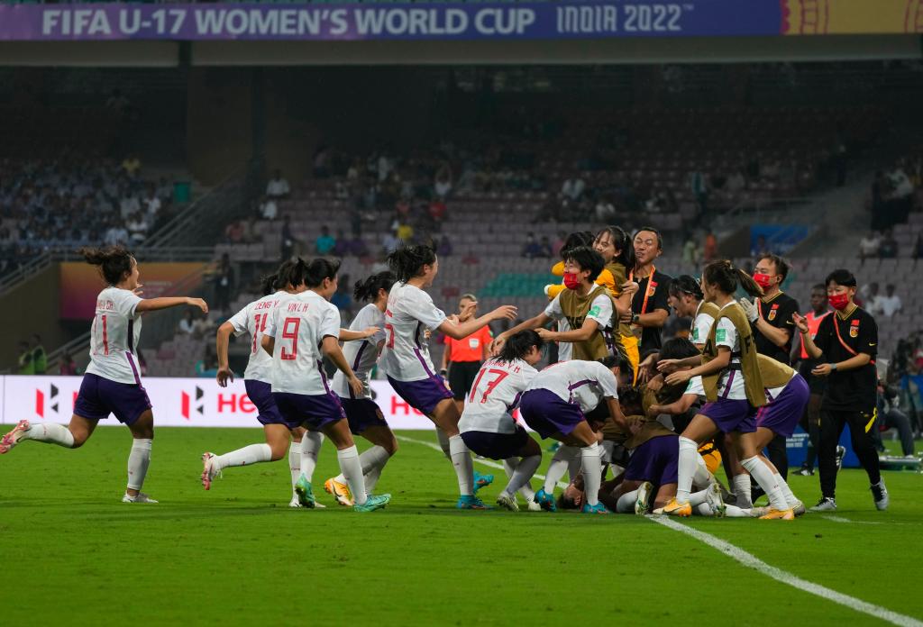 10月12日,中國隊球員喬睿琪(右三)在比賽中主罰點球命中后慶祝。新華社/美聯(lián)