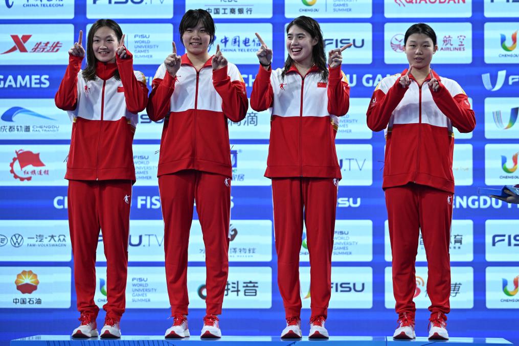 從日本福岡世錦賽凱旋的世界“蛙王”覃海洋和“蝶后”張雨霏當(dāng)天凌晨才到成都,隨即刷新男子100米蛙泳和女子50米蝶泳的賽會(huì)紀(jì)錄。張雨霏還率領(lǐng)中國(guó)隊(duì)以3分37秒51的成績(jī)創(chuàng)造了女子4x100米自由泳接力賽會(huì)紀(jì)錄,開啟成都大運(yùn)會(huì)游泳奪金之旅。