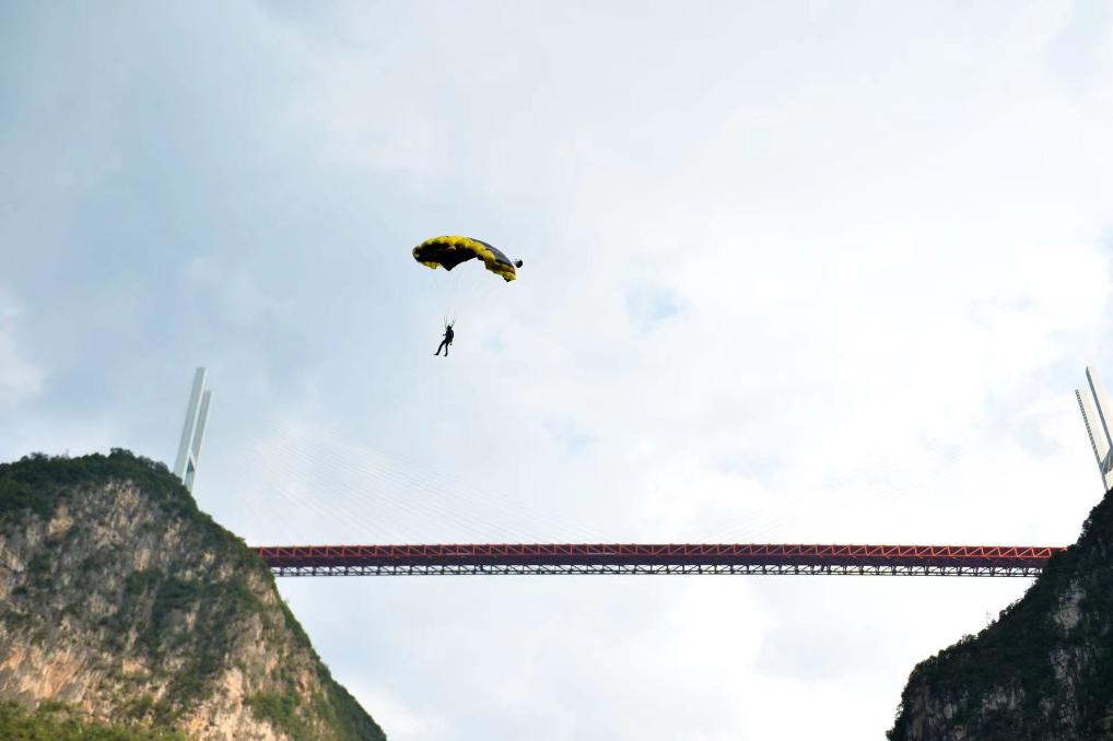 新華社貴陽(yáng)9月6日電(記者駱飛、吳思)6日上午,極限運(yùn)動(dòng)員們相繼從北盤(pán)江大橋上飛躍而下,拉開(kāi)了在貴州省六盤(pán)水市舉行的2023國(guó)際高橋極限運(yùn)動(dòng)邀請(qǐng)賽世界第一高橋站低空跳傘角逐的序幕。