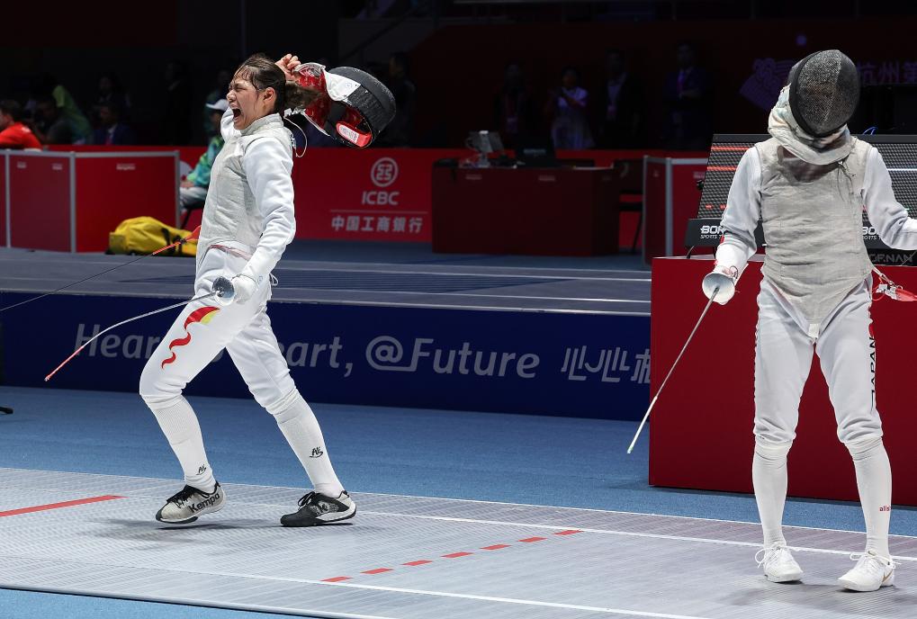 開局互相試探后,東晟良率先發(fā)起進(jìn)攻,被黃芊芊化解。在令人窒息的緊張氛圍中,兩人幾乎同時出手,黃芊芊刺中對手右肩,亮燈得分,她一把摘下面罩,怒吼慶祝。