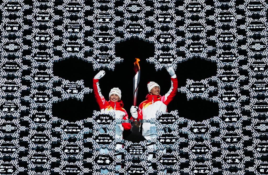 2022年2月4日晚,第二十四屆冬季奧林匹克運(yùn)動(dòng)會(huì)開幕式在北京國(guó)家體育場(chǎng)舉行。這是最后一棒火炬手迪妮格爾·衣拉木江和趙嘉文(右)。新華社記者 曹燦 攝