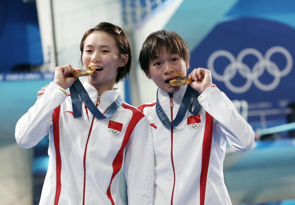 7月31日,冠軍中國選手陳芋汐(左)/全紅嬋在頒獎(jiǎng)儀式上。當(dāng)日,在巴黎奧運(yùn)會(huì)跳水女子雙人十米臺決賽中,陳芋汐/全紅嬋奪得金牌。新華社記者 張玉薇 攝