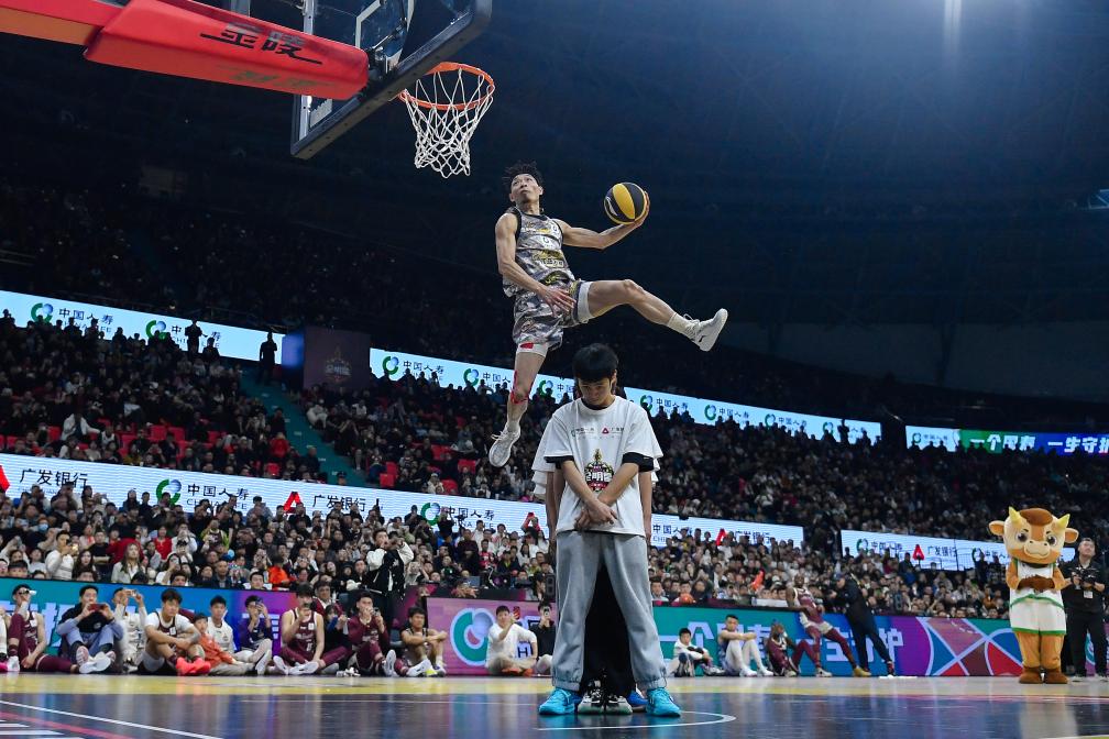 3月2日,北區(qū)明星隊球員鄒雨宸(右)在比賽中扣籃。新華社記者 許暢 攝